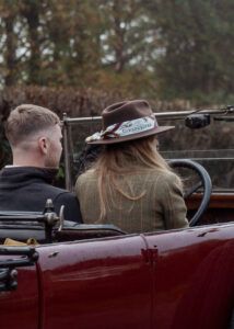 two women looking at a camera and woman in an old car, behind the scenes of a commercial photoshoot