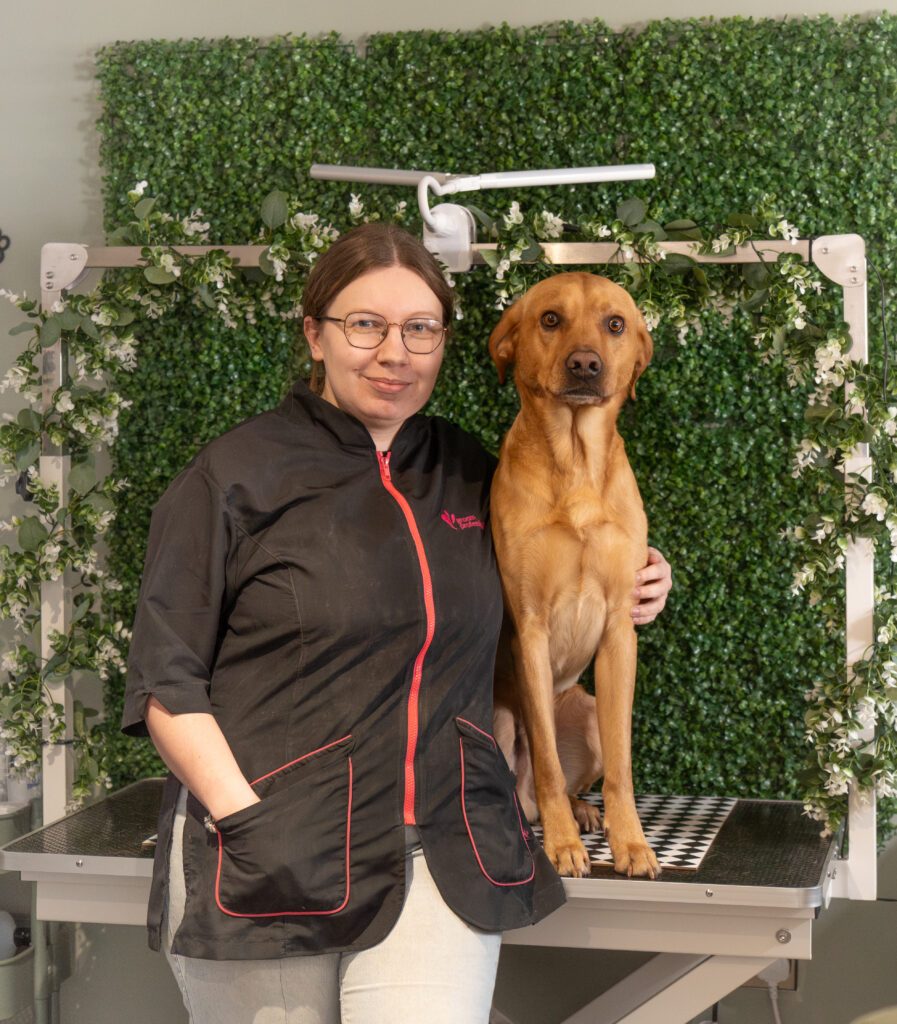 A quiet and comfortable one to one dog grooming salon run by Lana, who is pictured here with her dog. Lana works with all breeds of dog on an individual basis providing a calm and chilled environment for dogs to feel confident and happy. Every dog receives a free health check at the beginning of their session to assess their coat and wellbeing, ensuring the best level of care for all dogs that are groomed at Wash & Wiggle Grooming. Lana is also canine first aid trained, so you can be assured your dog will be in safe hands.
