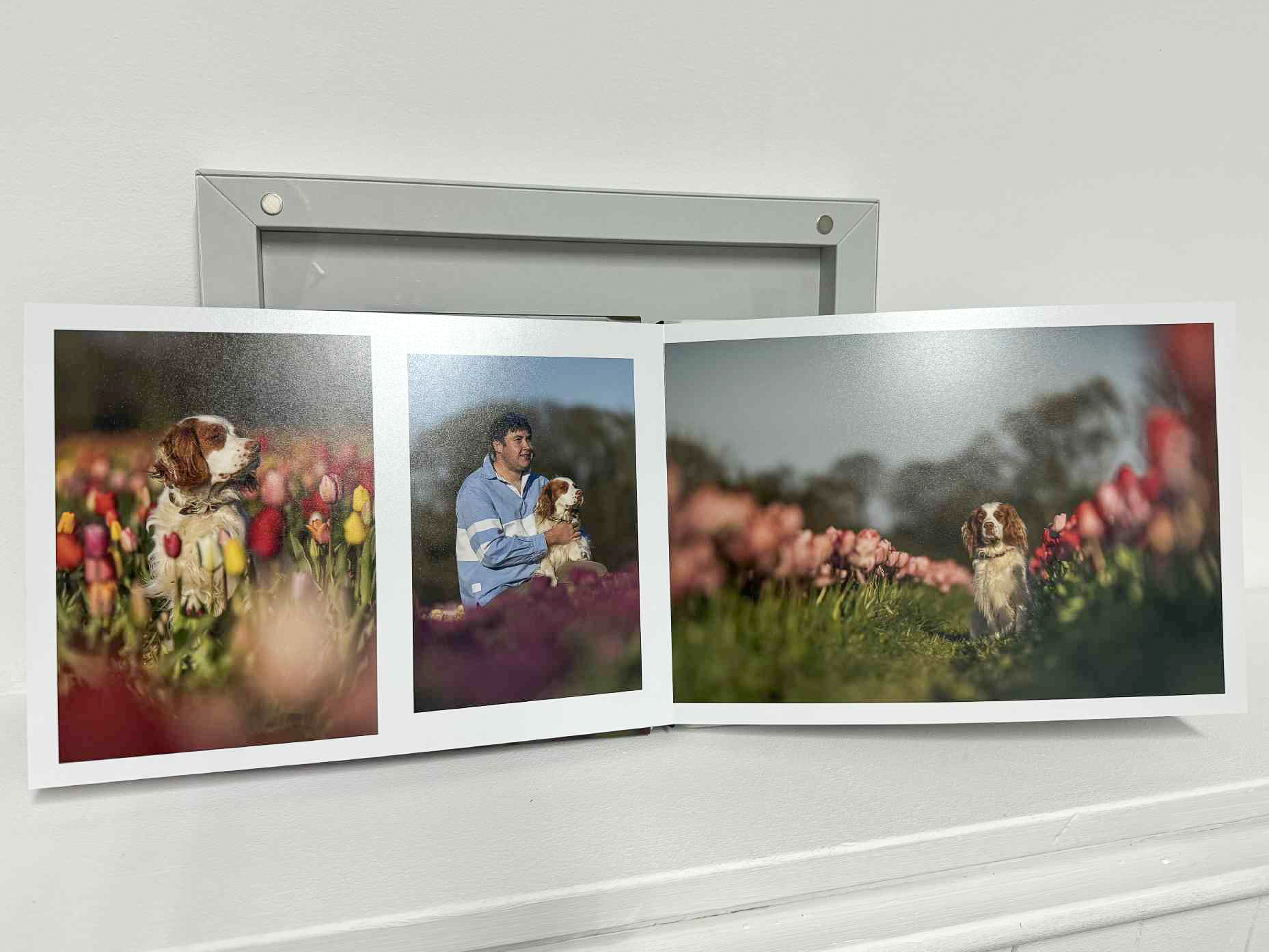 The Accordion Mini Book is a small and cute desktop display, perfect for taking with you in your bag or displaying on a shelf/desk. It features 12 photos inside of a 12cmx12cm velvet, magnetic book. The accordion mini book is £70.